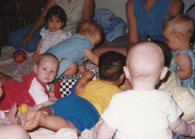 I was desperate for mommy friends, so with a nine day old newborn in tow, I went to the very first “playgroup” meeting on a chilly Thursday afternoon. There were four new moms in attendance. There was an eight month old, a four month old, a three month old, nine day old Chandler, and three other mothers trying to figure out what the heck we were supposed to be doing. I held Chandler tightly and watched the other babies lie on their backs on the carpet, kicking their feet at their portable baby gyms.